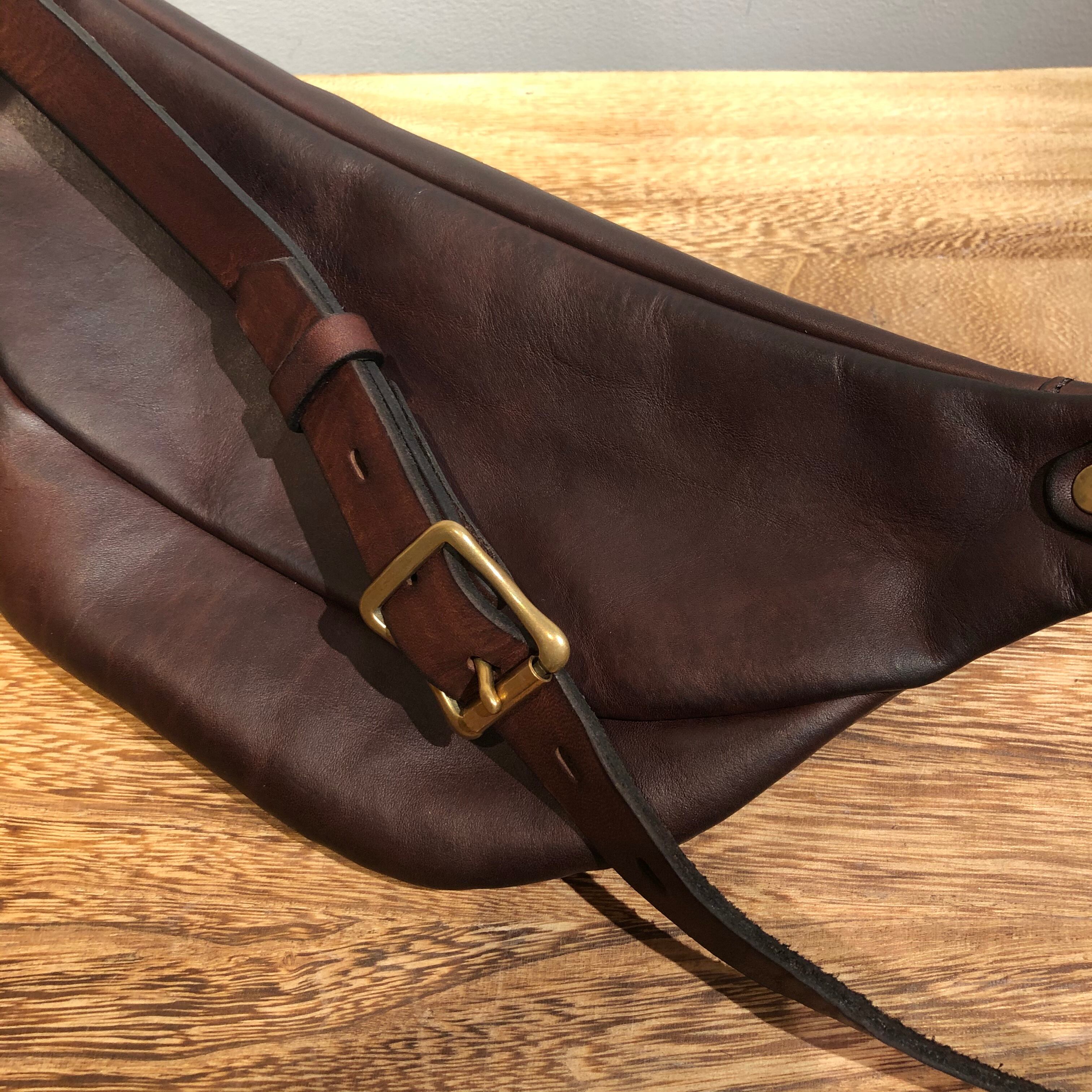 1970年代頃主流だったウエストバッグをモダナイズした、ウエストバッグミニタイプです。本体はソフトなキップレザー、ショルダーベルトは肉厚なカウレザーを使用。裏地にはコットンキャンバス生地を使用。
