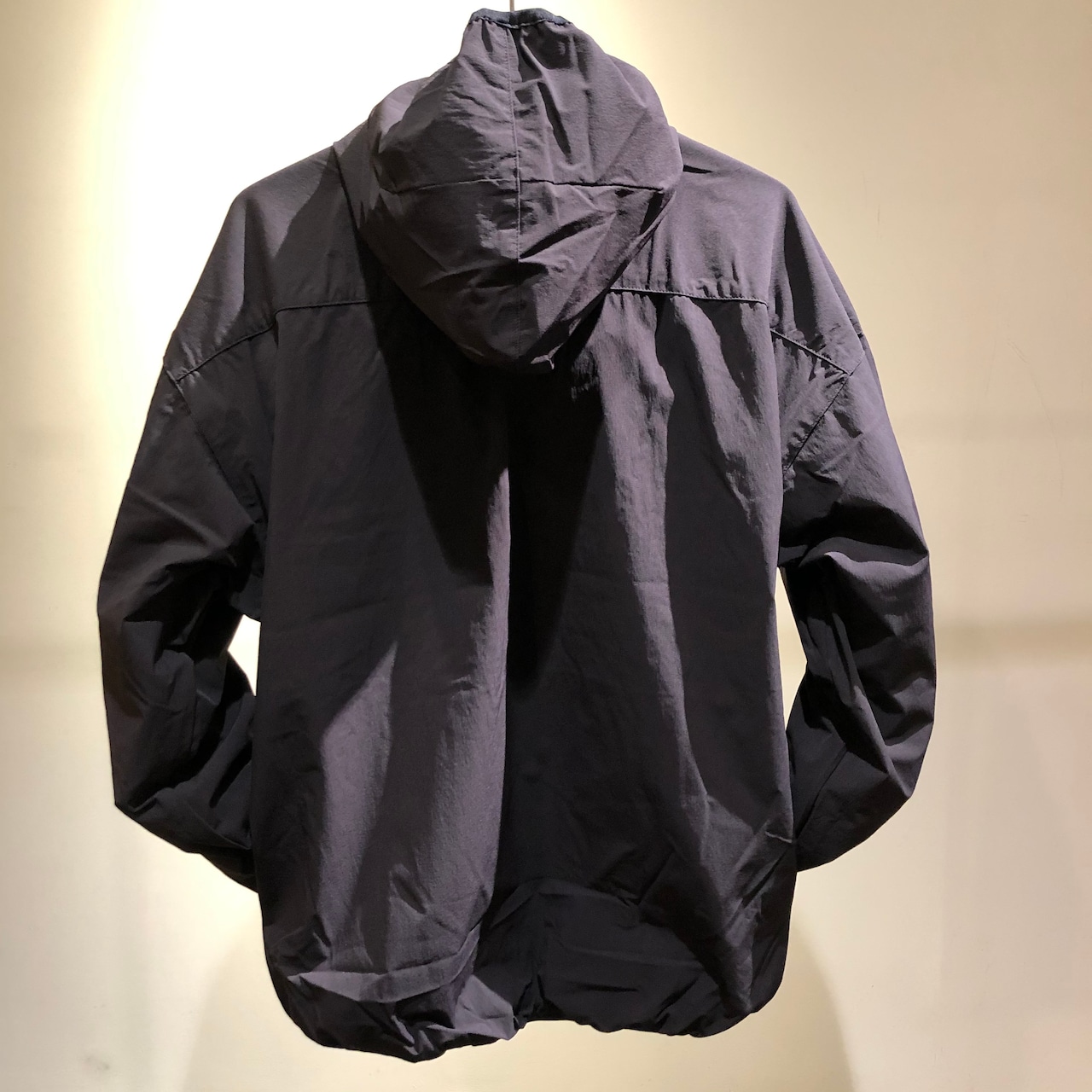 身幅・肩幅をゆったりとさせ、裾や袖口にゴムを使うことで、少し丸みを持たせたシルエットに。さらにフードまわりもゴム仕様でパイピングしており、美しいシルエットを形づくります。