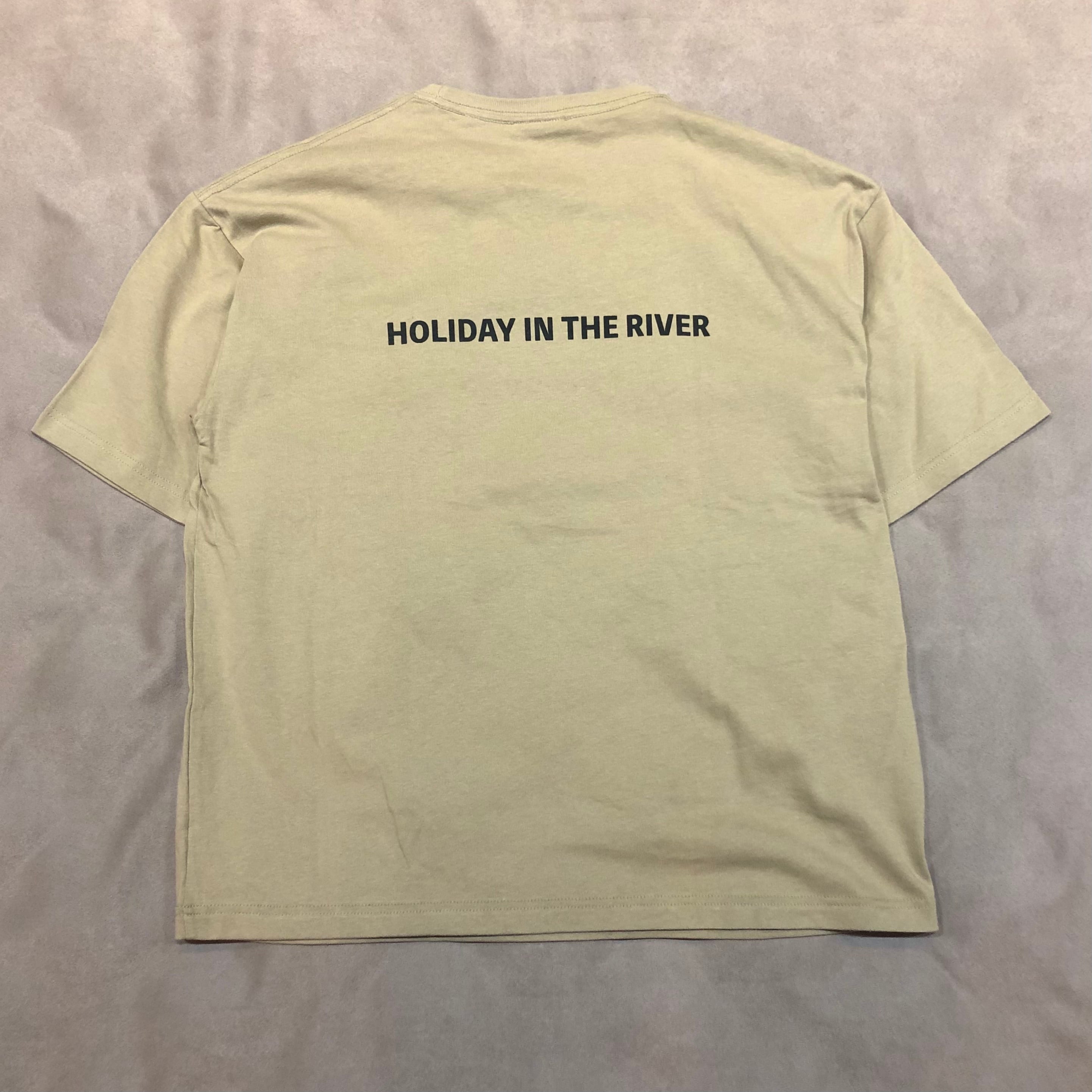 フロント胸ポケット上に『HOLIDAY』の刺繍、バックに『HOLIDAY IN THE RIVER』のプリントが施され、シンプル過ぎないアクセントになっています。