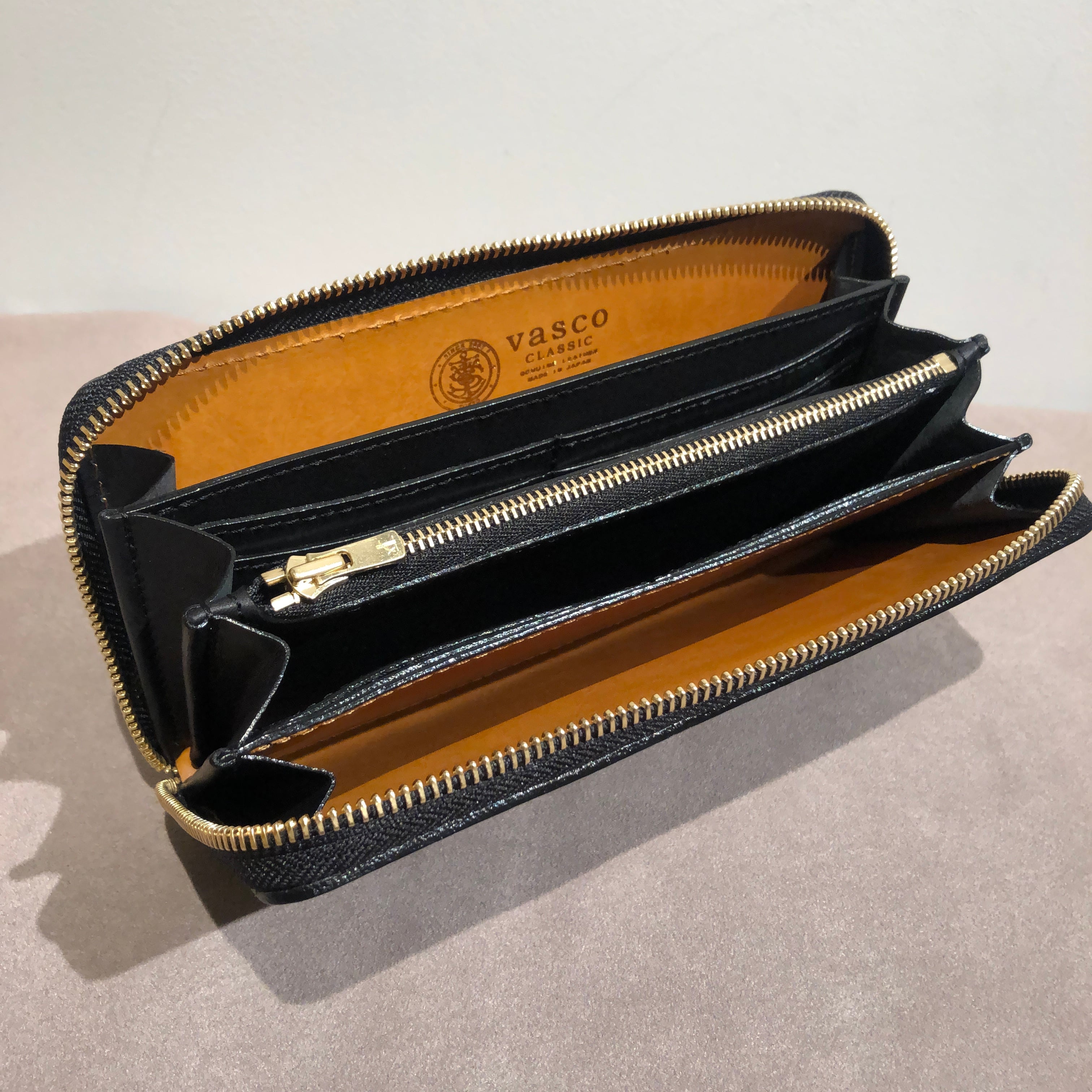 シンプルながらも機能性に拘った3方ジップタイプのロングウォレット。開いた時のマチもしっかりあるので、中も見やすく紙幣やカードの出し入れもしやすくなっております。通帳も入るサイズです。職人技術を感じ取れる切り目のコバの仕上げも丁寧に磨かれており、ベーシックなデザインながらもシャープでスッキリとした印象が特徴です。